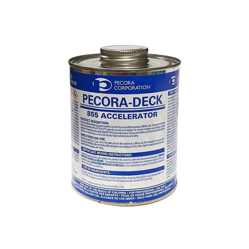 | Description | Pecora-Deck 855 Accelerator is designed to speed the cure of the Pecora-Deck 802 Base, 804 Intermediate and 806 Top coats. This product is especially useful at temperatures of 40 to 70°F(4 to 21°C), where the cure rate can be sluggish. |